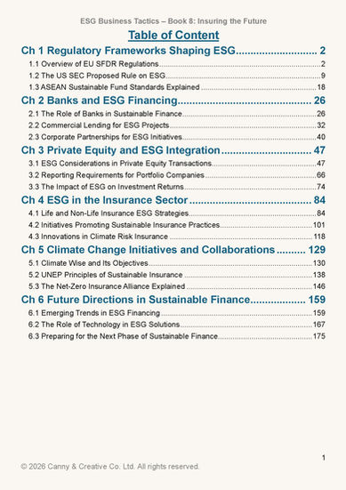 Book 8 the integration of ESG considerations into the financial sector, particularly focusing on insurance, banking, and investment practices. It highlights the growing importance of sustainable finance and regulatory frameworks aimed at enhancing transparency and accountability in ESG reporting.